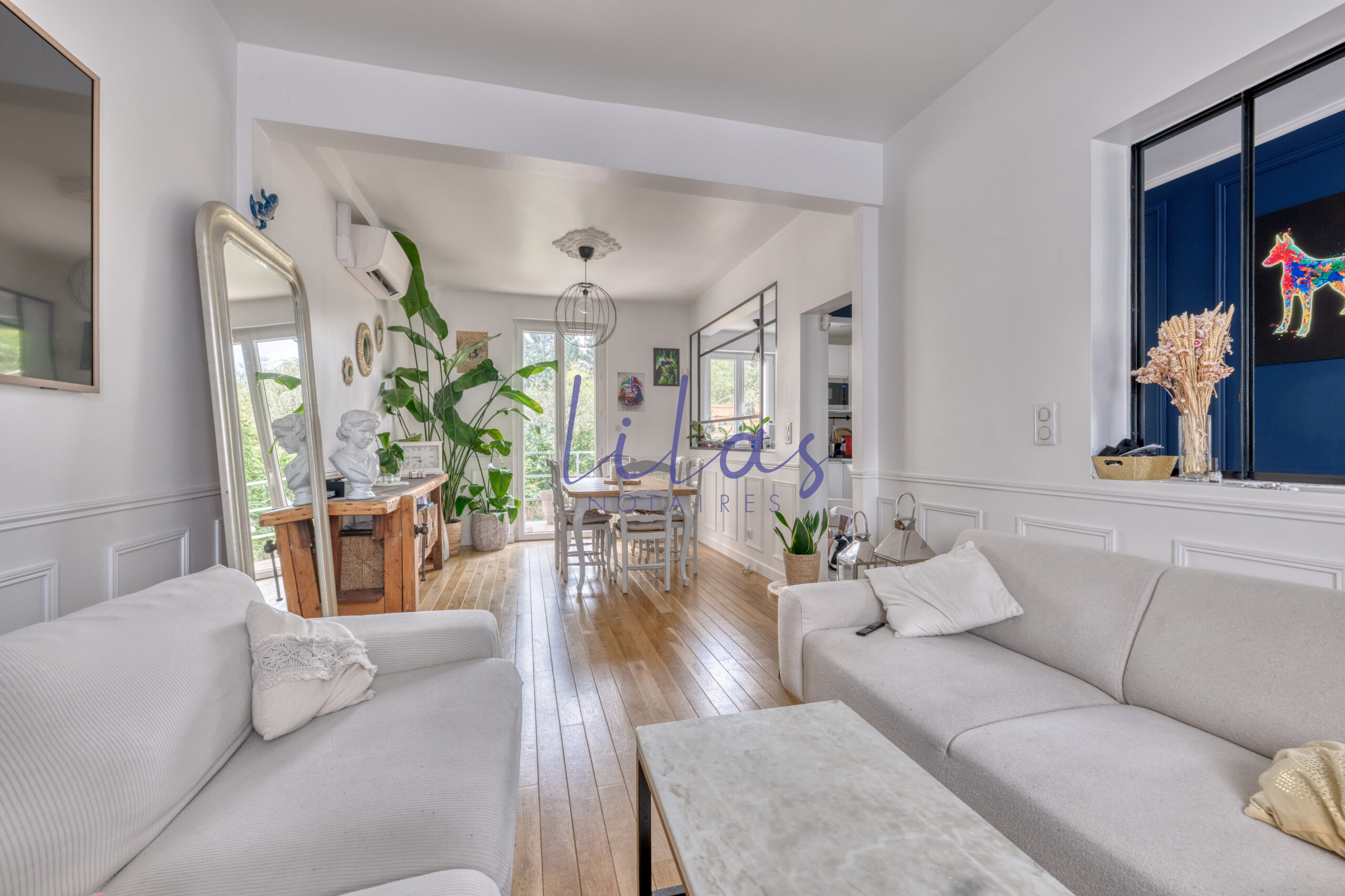 Salon / salle à manger aux beaux volumes, parqueté et orné de moulures,